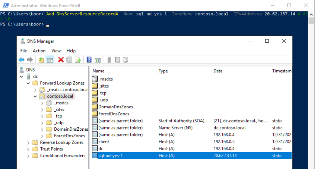 Add-DnsServerResourceRecordA -Name sql-ad-yes-1 -ZoneName contoso.local -IPv4Address 20.62.137.14 # AKS LBCreate Windows Logins