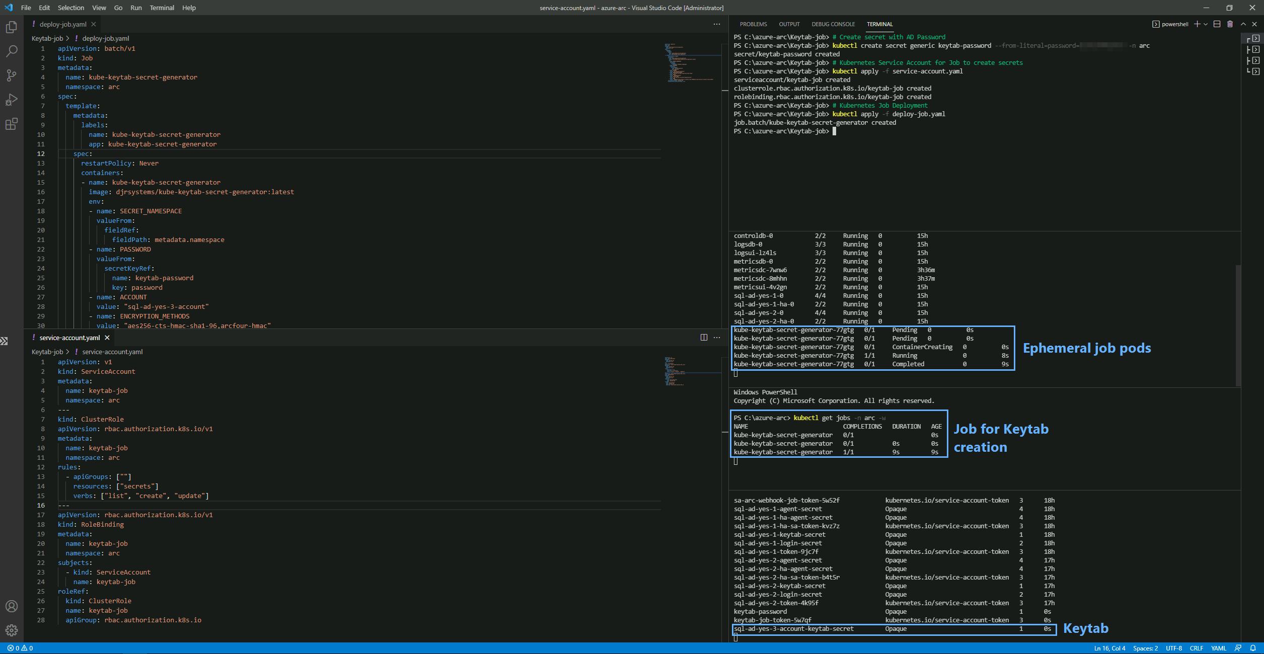 kubectl get secret sql-ad-yes-1-keytab-secret -n arc -o yamlWe see am ephemeral pod get spun up for the Job running under the context of the ServiceAccount: