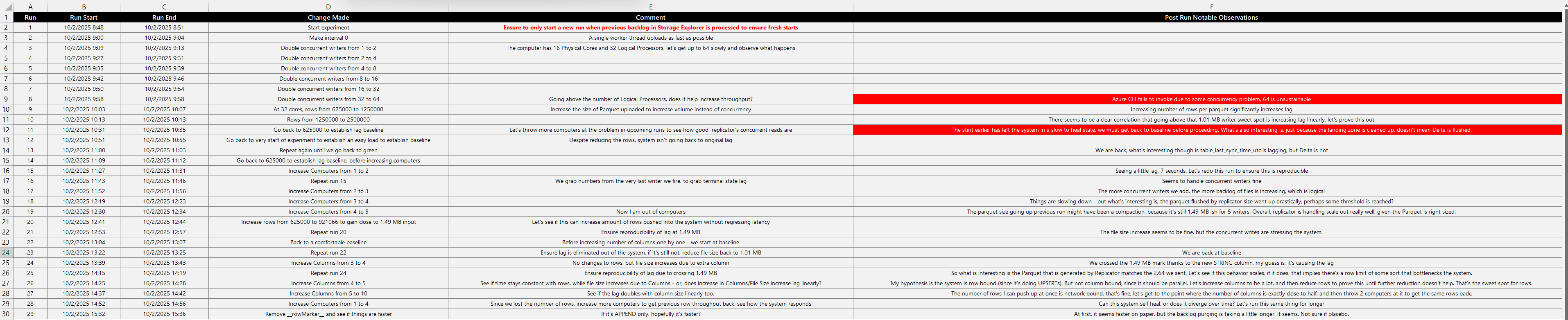 F. Post Run Notable Observations - RED implies I broke something with my input (AKA Significant Lag and Backlog) and had to let the system self-recover before moving onto the next run