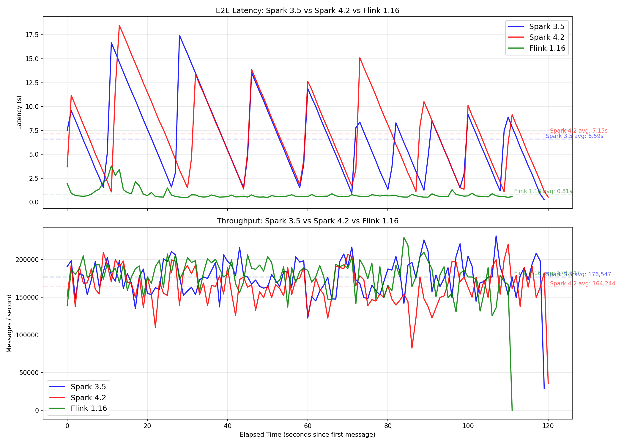 producer-csharp-1 | [Stats] Total sent: 21,164,306 | Last 10s: 155,233 msg/s | Overall: 175,845 msg/sFor consumers, since Spark flushes to Delta Lake after each Microbatch, the best case latency you get is about 2 seconds (end of Microbatch), with worst case getting around 15 seconds (start of Microbatch) - in a saw-toothed pattern. Flink is significantly more stable at ~1 second latency:
